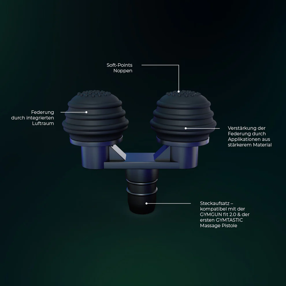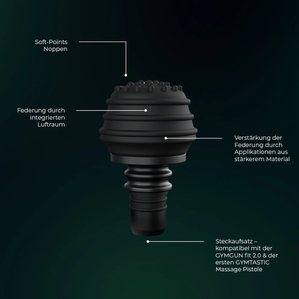 | 🟢 Soft-Point Head | Einzelner weicher Punkt | Ideal zur gezielten Behandlung von Triggerpunkten und empfindlichen Bereichen. Sorgt für eine präzise Tiefengewebsmassage und löst Verspannungen genau dort, wo sie benötigt werden. |
